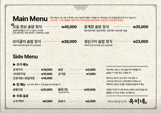 - 정식 메뉴는 2인 이상 주문 필수: 일부 메뉴는 2인분부터 주문이 가능하므로 참고하시기 바랍니다.